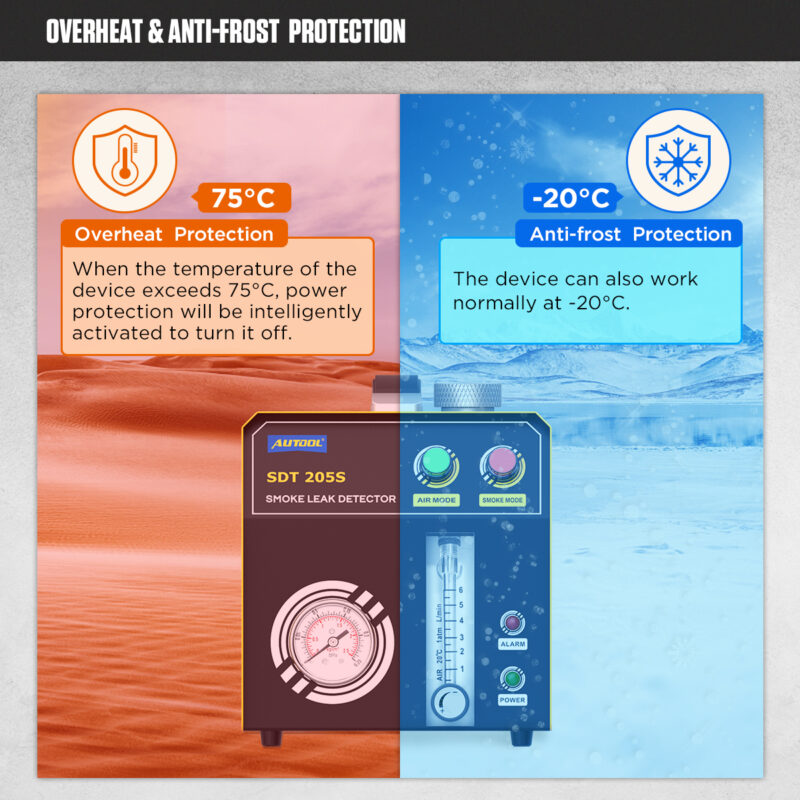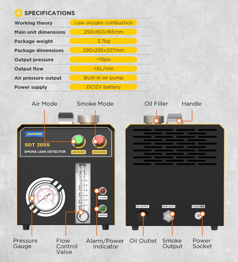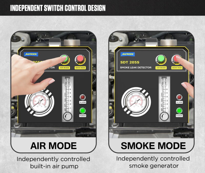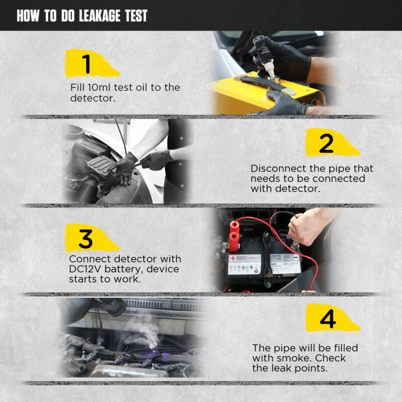 MÅNGSIDIG SYSTEMDIAGNOSTIKEnheten genererar rök vid ett optimalt tryck (upp till 15 PSI / ca 1 bar), vilket gör det möjligt att säkert testa de flesta system i bilar, skåpbilar och motorcyklar. Huvudsakliga testområden: