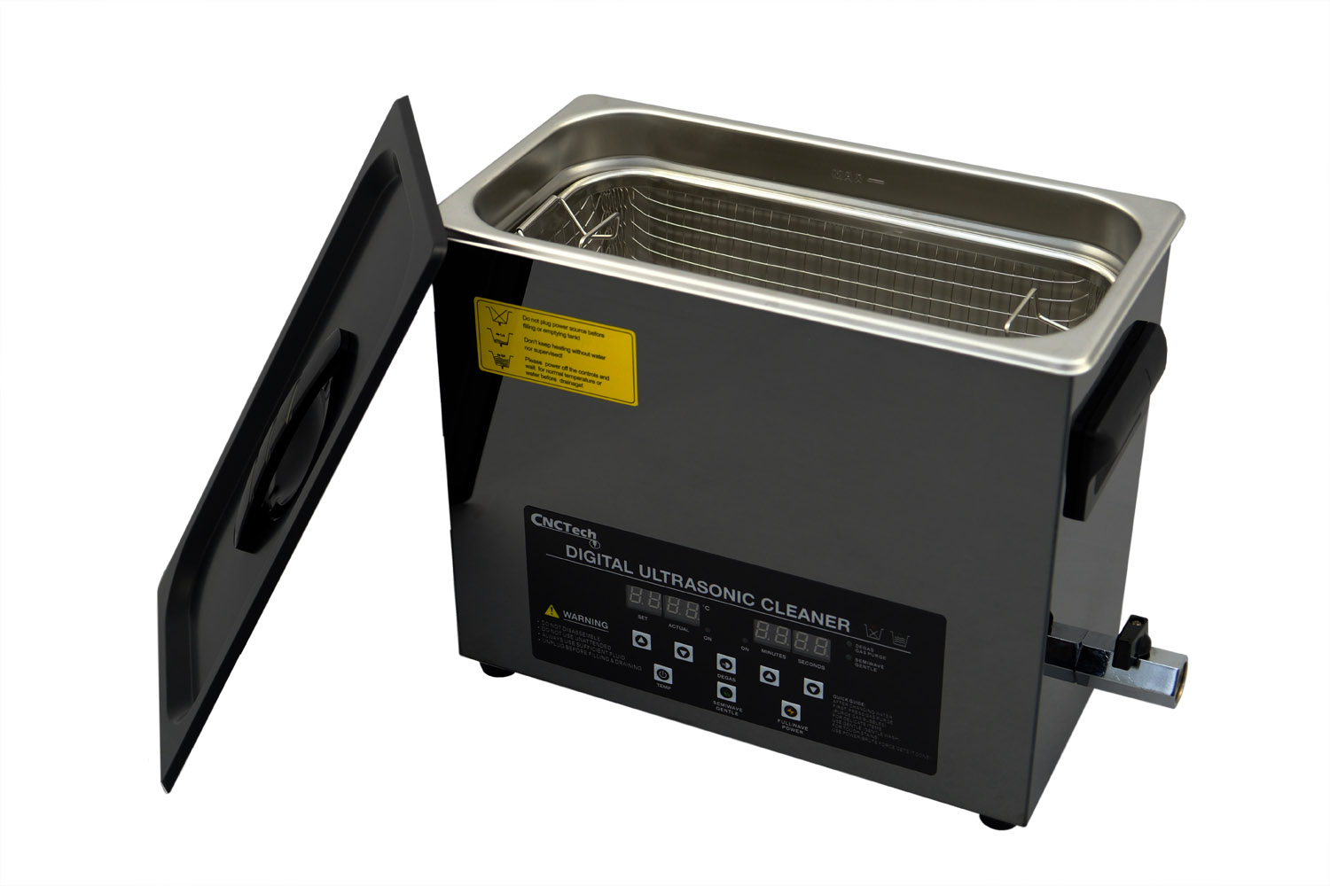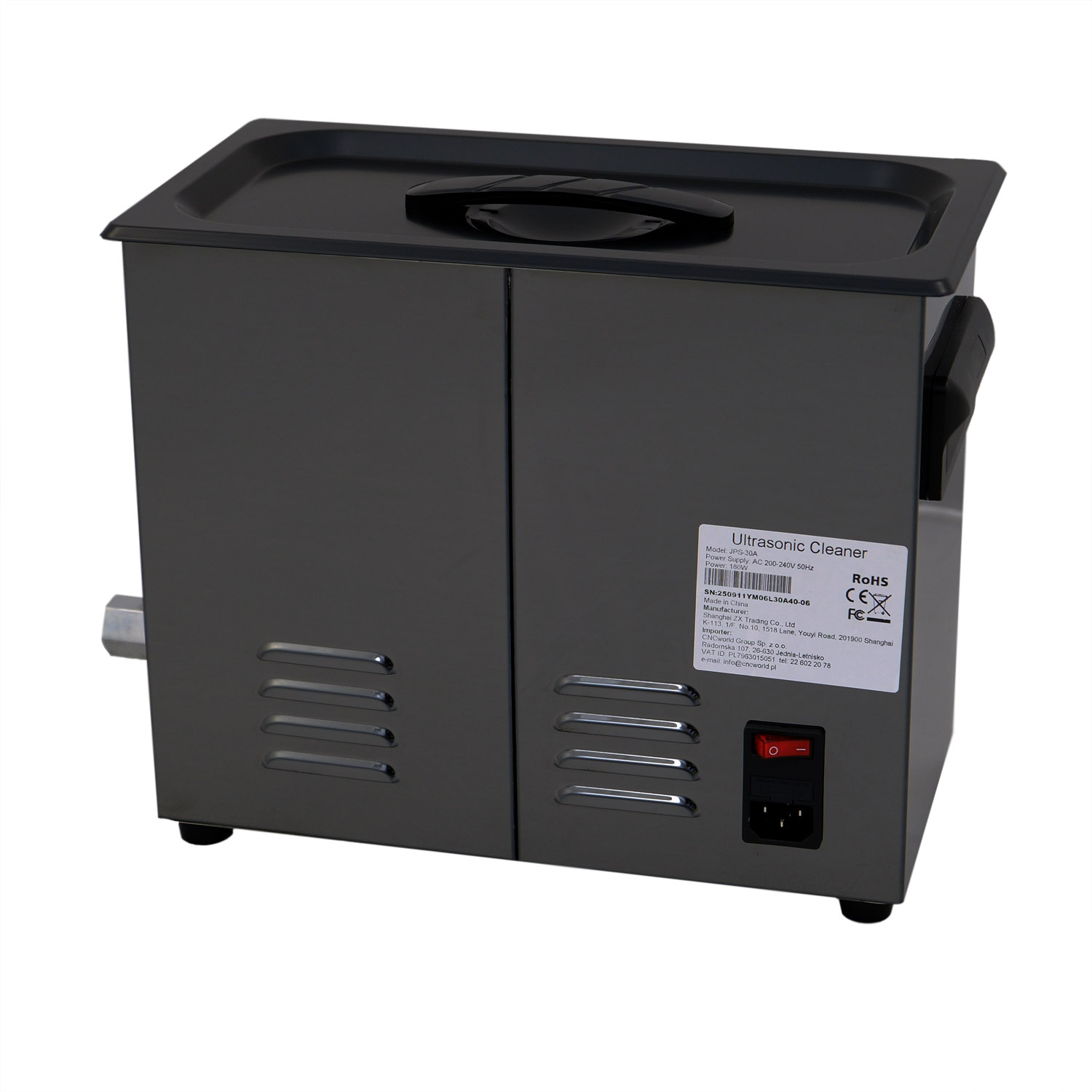Ultraljudsrengöraren GX30A är utrustad med en behållare av högkvalitativt rostfritt stål SUS304 med en kapacitet på 6 liter, en ultraljudseffekt på 180 W och en värmeeffekt på 200 W.