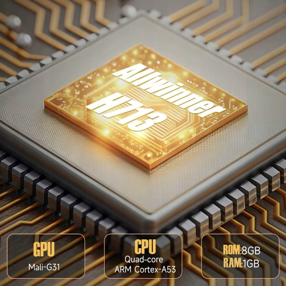 Avancerad Allwinner H713-processor med fyrkärnig CPU och Mali-G31 GPU säkerställer ultrasnabb drift och bra prestanda.